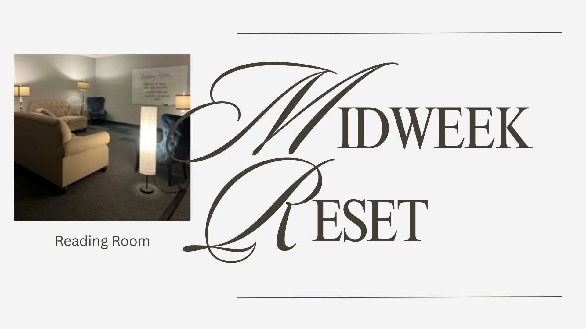 Midweek Reading Reset Wednesday, September 10, 2025 6:00 PM Wednesday, November 19, 2025 7:00 PM Cliff Temple Baptist Church (map) Google Calendar ICS Need space for peace and quiet to read a good book? If so, we designed this midweek reset just for you. Head up to the reading room (Room 232) to get started.